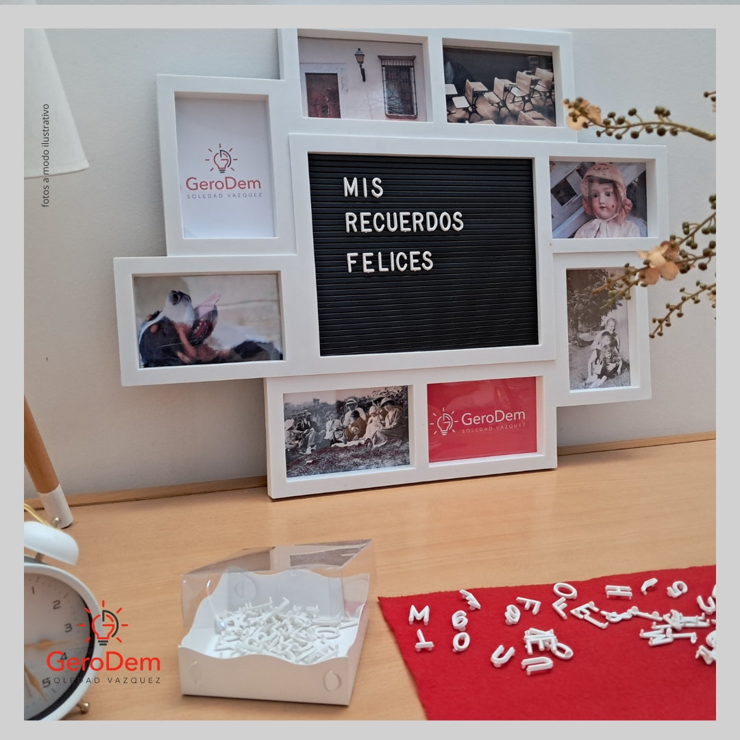 Un portarretratos múltiple con pizarra central para escribir mensajes. Diseñado para estimular la memoria afectiva y procesos como la atención, el lenguaje y la orientación.